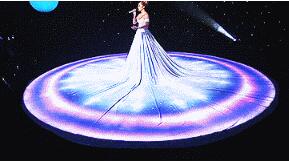 早在2015年的《美國偶像》上,Jennifer Lopez就身著一條直徑6米白色投影裙,她唱著唱著,白裙子就消失在黑夜里,星空和宇宙,慢慢爬上了她的裙擺,隨著燈光的變化,她的裙子上出現了云彩、銀河、雨點。從上往下看,就像一個圓形的幕布一樣,給現場著實帶來了一場充滿科技感的視覺盛宴。