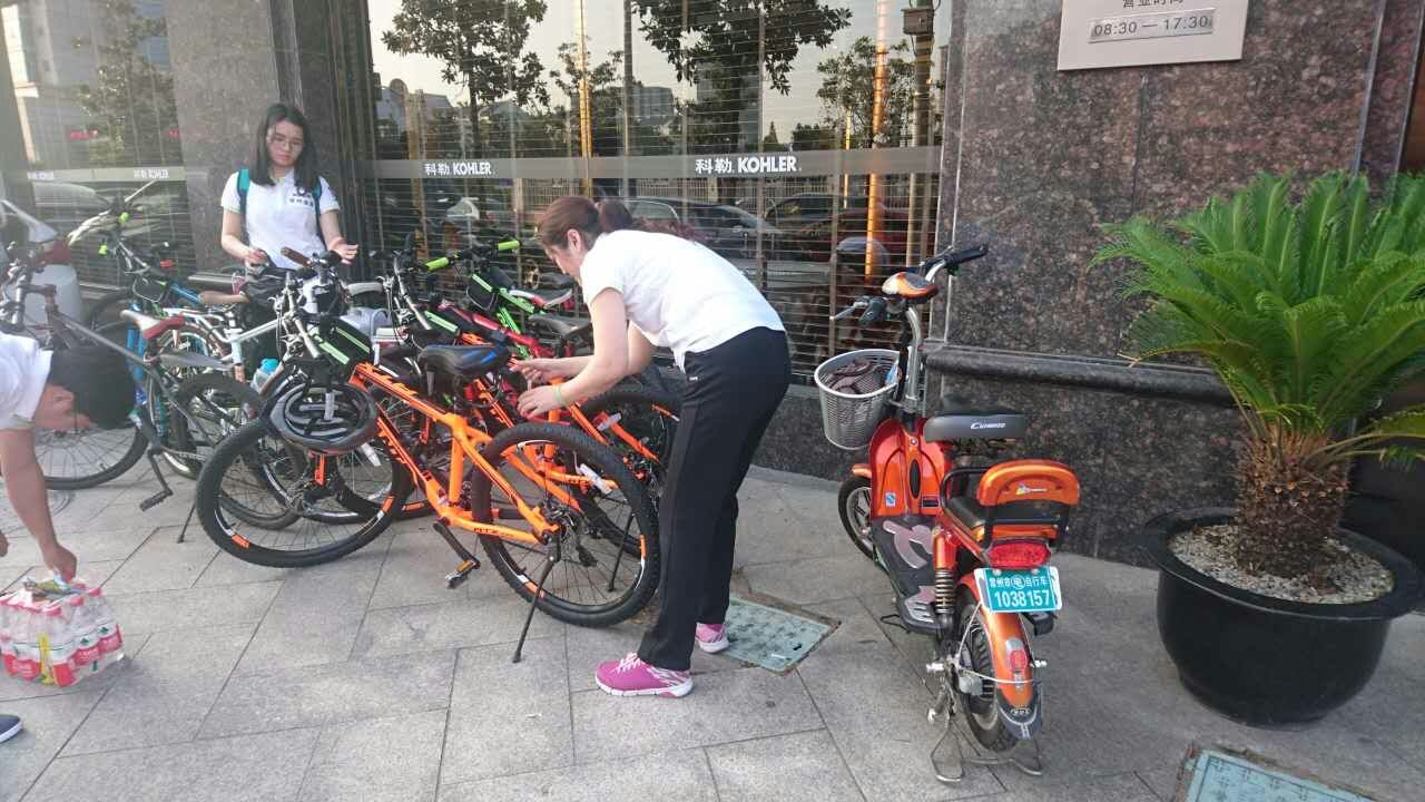 小伙伴們檢查裝備,為首次騎行活動做準(zhǔn)備